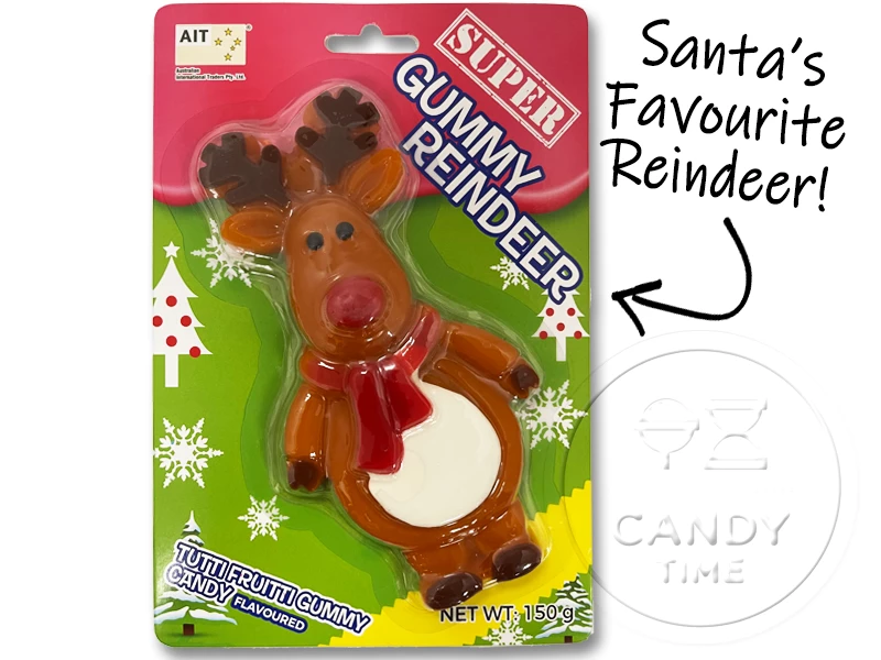 A super-sized, Tutti Frutti flavoured gummy candy, in the shape of Santas Reindeer, complete with a red nose and scarf!