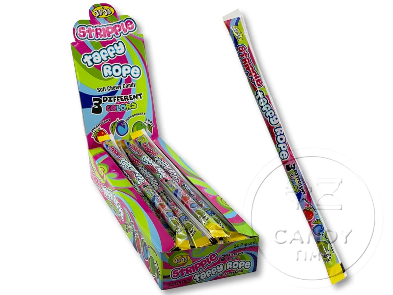 Soft, chewy taffy ropes with 3 flavours in each box: Green Apple, Blue Raspberry & Strawberry.