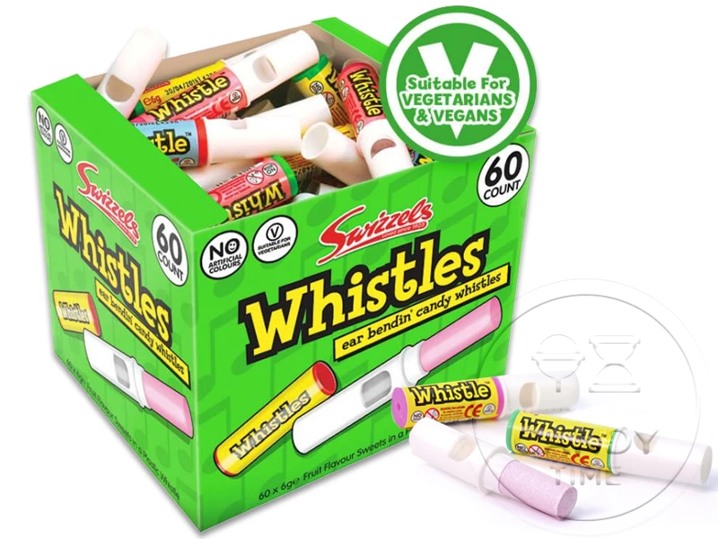 Fruit flavoured sweets in a ear bendin’ plastic whistle!